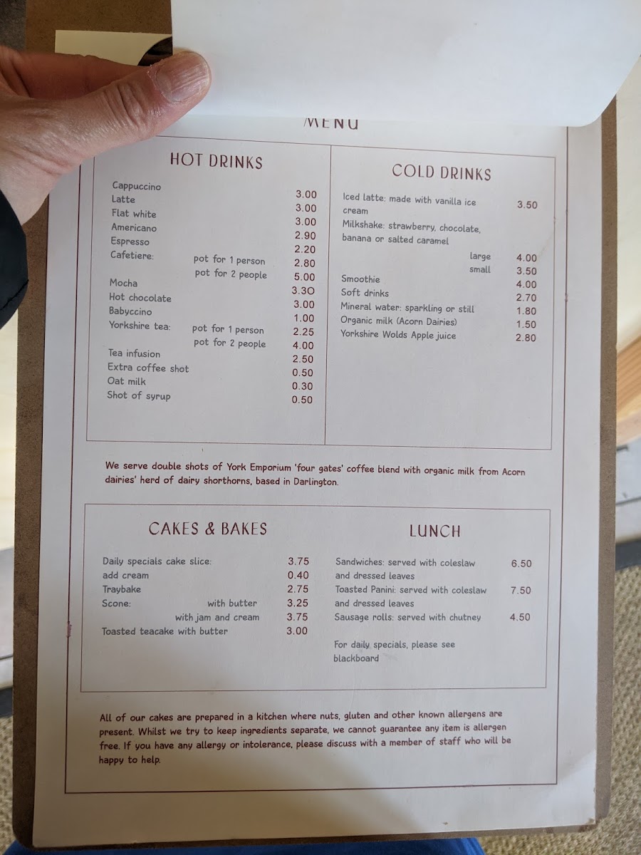 The menu at Whiteley's at Home Farm in Alne offers a range of hot drinks, light meals, and baked goods suitable for breakfast, coffee breaks, or casual light dining. Visitors can choose from a variety of hot beverages, including several styles of coffee such as cappuccino, latte, flat white, Americano, espresso, and mocha, as well as hot chocolate, Yorkshire tea, and tea infusions. Options to customize drinks with extra coffee shots, oat milk, or flavored syrups are also available.