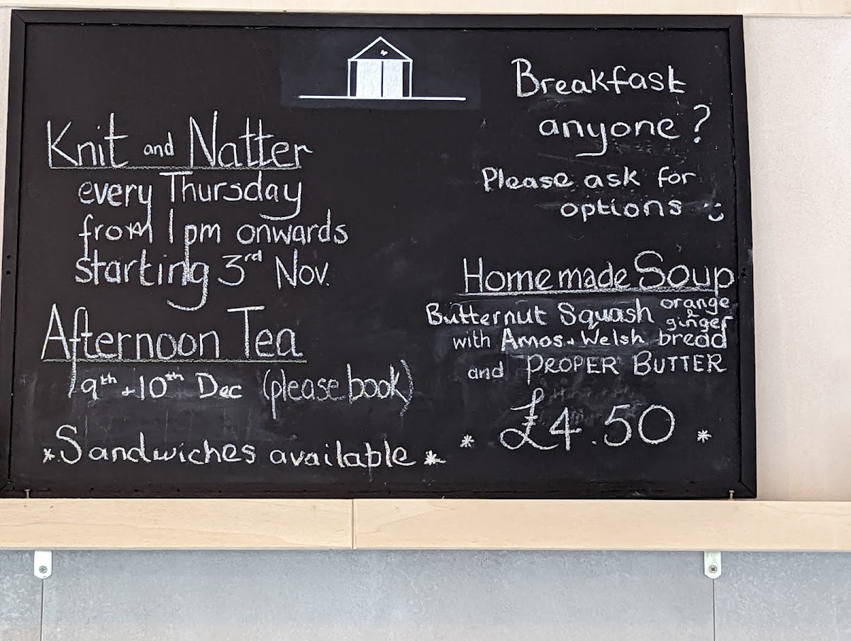 For food, the menu includes light bites and snacks such as a tea, cheese and chutney sandwich, as well as a daily soup served with a ham roll. Baked goods feature daily special cake slices, traybakes, scones, and toasted teacakes with butter. An afternoon tea option is also offered, providing a selection of items suitable for a more leisurely meal experience.